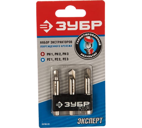 Набор экстракторов поврежденного крепежа, 3 шт. ЗУБР 26700-H3 предназначен для выкручивания крепежа с поврежденным шлицем. Специально разработанная форма экстрактора позволяет выкручивать крепеж с износом граней шлица до 95%