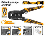 Кримпер для обжима телефонных и компьютерных клемм INGCO HMPC1468P предназначен для перекусывания или обжима кабелей и проводов для подключения компьютеров или телефонов и имеют типоразмер 4P/6P/8P, RJ-45, RJ-11, RJ-12.