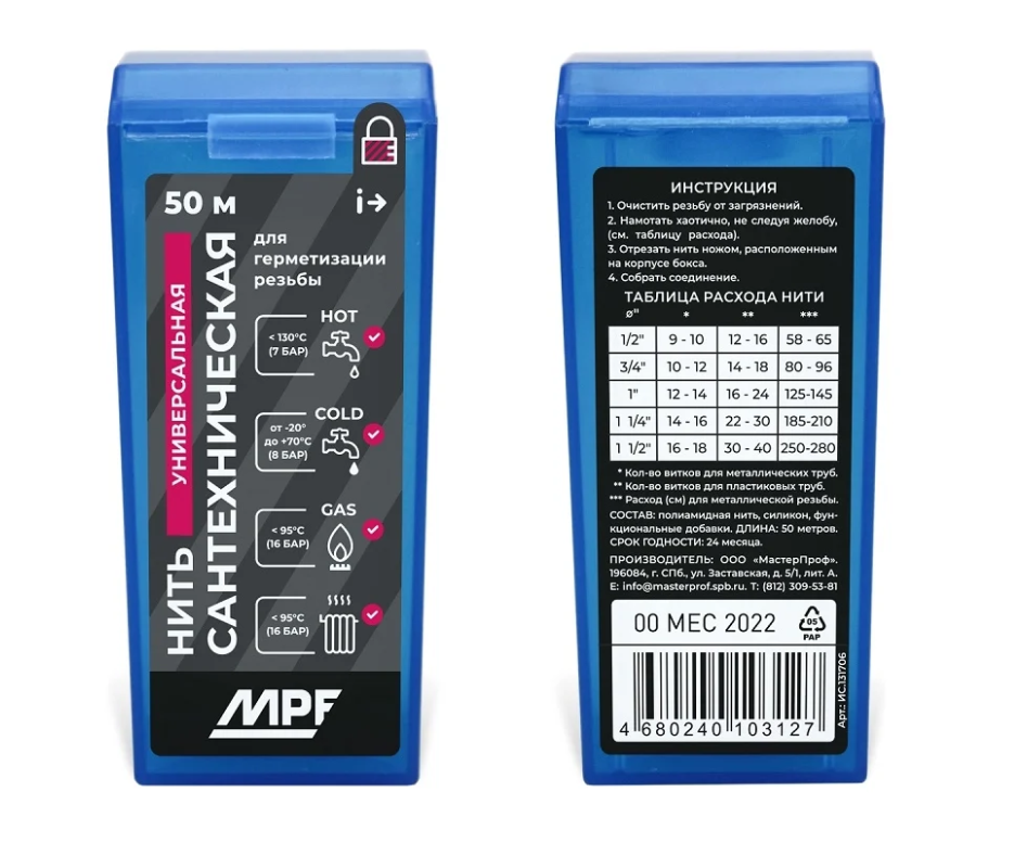 Нить сантехническая для резьбовых соединений MPF 50м, MP-У